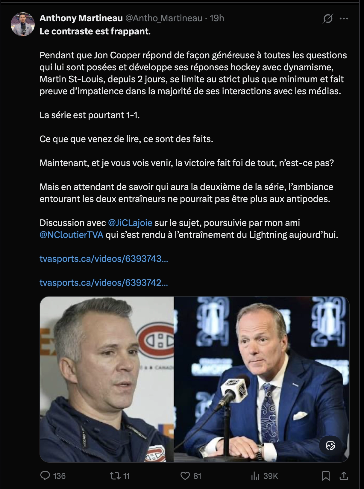 Parce qu’en parallèle, Anthony Martineau décrit un Martin St-Louis fermé, impatient, tendu devant les médias, alors que Jon Cooper, lui, est décrit comme énergique, bavard, presque relaxe malgré la pression.