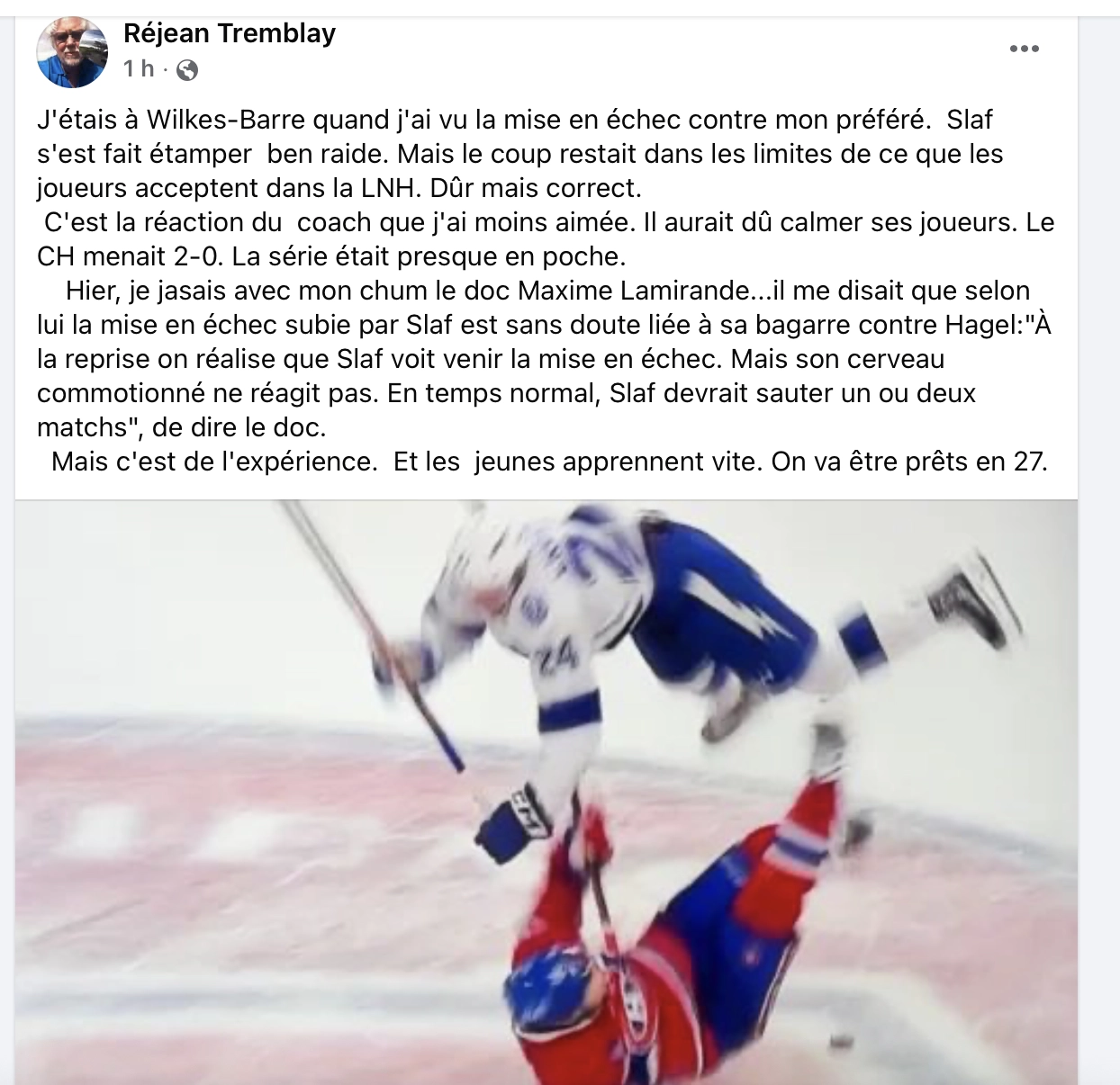 « Hier, je jasais avec mon chum le doc Maxime Lamirande… il me disait que selon lui la mise en échec subie par Slaf est sans doute liée à sa bagarre contre Hagel.. »